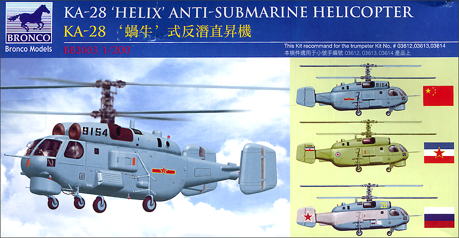 A 1/200-scale model kit of the Ka-28 "Helix" anti-submarine helicopter. Well-detailed for the scale, it includes decals for the Chinese People's Liberation Army Navy, Russian Navy, and Yugoslavia.