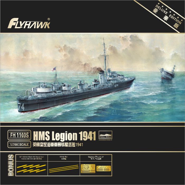 This deluxe full-hull edition of Flyhawk's HMS Legion model kit, depicting the ship as she was seen in 1941, includes eight metal gun barrels (QF 102mm Mark XVI naval guns), metal rods, and upgraded photo-etched parts.