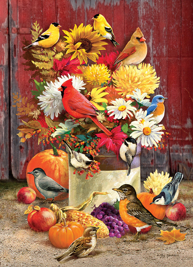 A beautiful Autumn Bouquet surrounded by pumpkins and other fruit are just the thing to attract the birds in this festive 1000 piece puzzle.