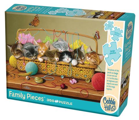 A good kind of Basket Case - sleeping kittens tuckered out from playing with yarn! An adorable Family Pieces 350 puzzle for the whole family to enjoy.