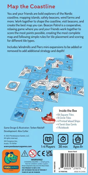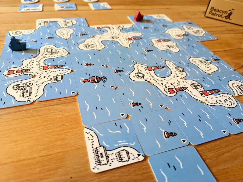 Beacon Patrol is a coop tile laying exploration game in which you navigate the coast of the northsea to secure its beacon buoys, lighthouses and waterways.
