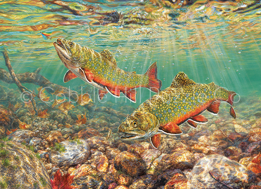 The beautiful Brook Trout swim so innocently. Will they fall for the bait? A beautiful 1000 piece fish puzzle full of fall colours to be enjoyed all year long.