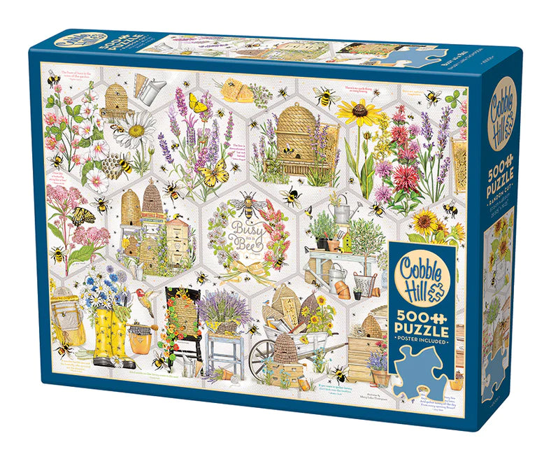 If you're a gardener, bee lover, or fan of puzzle collages, then you'll keep as Busy as a Bee with this fun 500 piece puzzle all about the buzzed life. Fun quotes and facts are sprinkled throughout the flowers and garden accessories all against a beehive background.