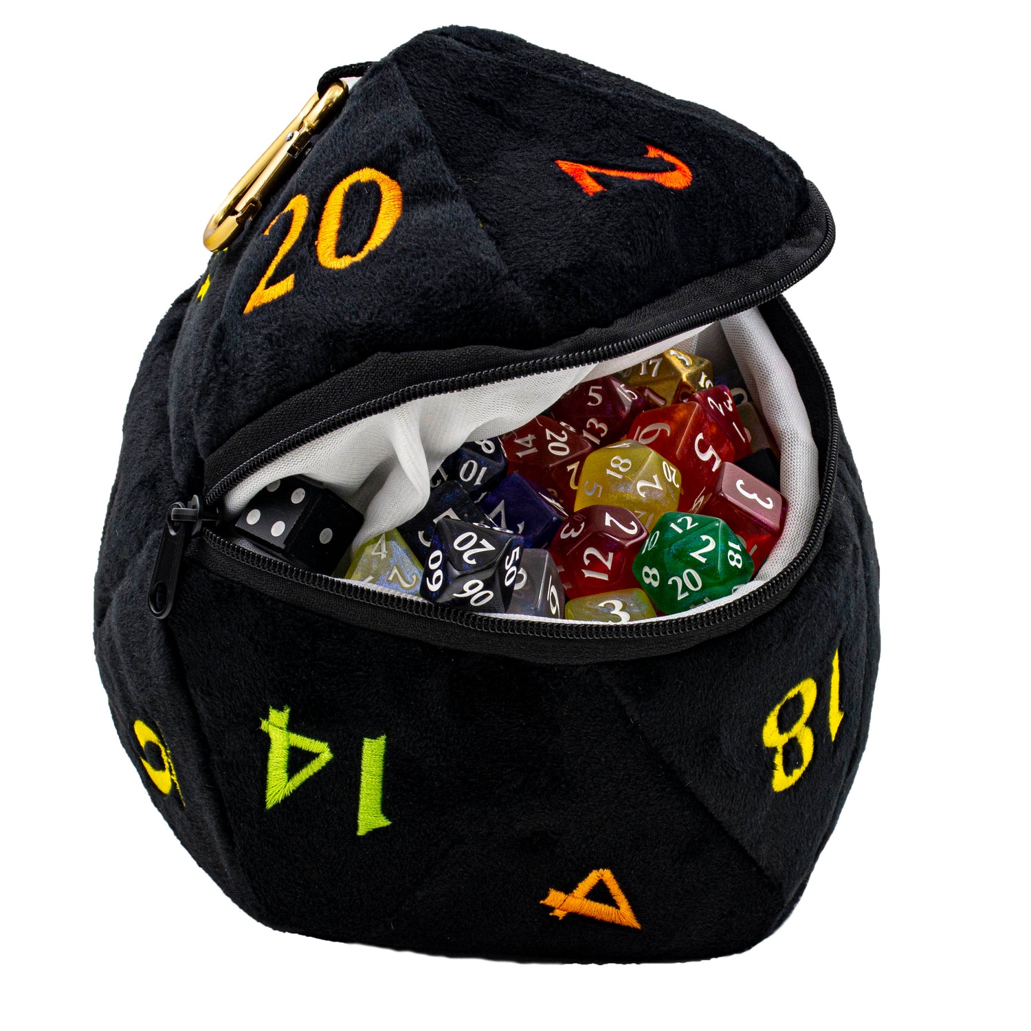 Need dice hoarding organization? We've got you covered with a new bag inspired by our bestselling jumbo D20 plush! The zippered center pocket holds up to 50 dice, while a carabiner-style hook keeps your dice securely at your side. This Plush D20 Dice Bag measures approximately 6.5 inches in diameter, and is the perfect accessory for any RPG adventurer or dice enthusiast!