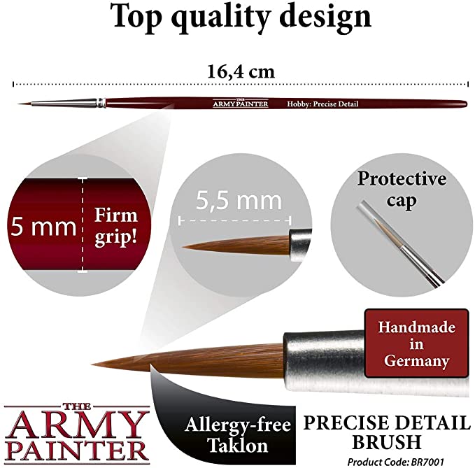This brush will allow you to perform any precision paint job you want on your miniatures. It has a very sharp point, is small and thin enough to get anywhere on a model.