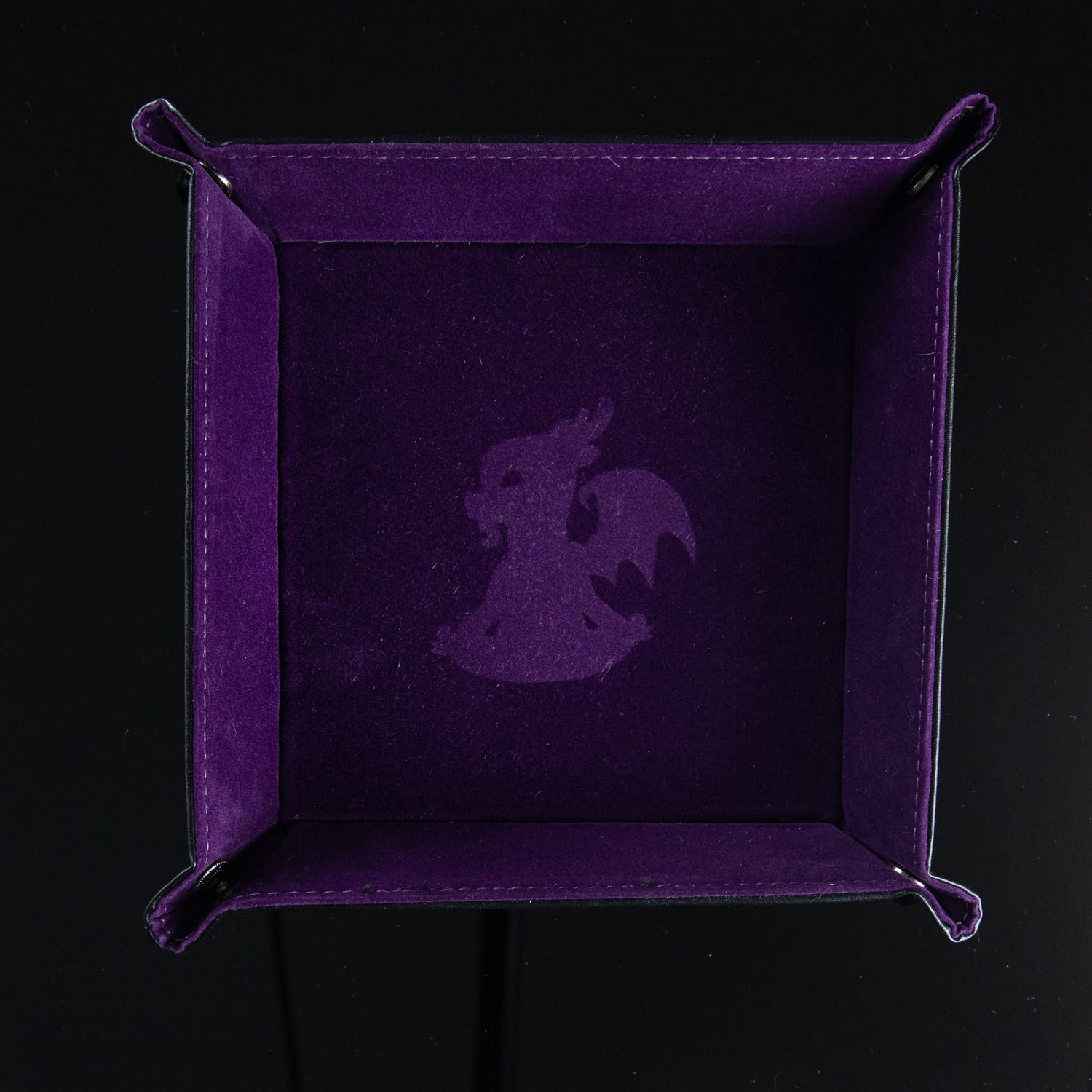 Soft Suede like fabric this dice tray can be snapped with the purple up or the leather up.