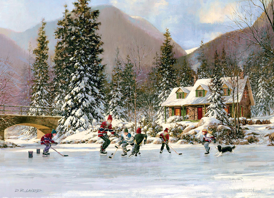 Dad announces it's time to head home for dinner, but the kids can't stop playing hockey now! Next Goal Wins! Winnie, the dog, races across the ice pond in hopes of scoring. A great Family Puzzle 350 piece that rings loud with winter fun and cheer!
