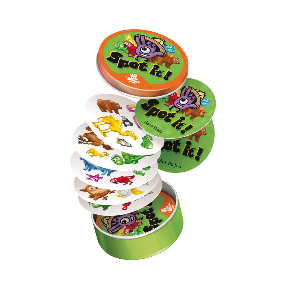 Spot It! Jr. Animals features the same game play as its parent Spot it! but in a simplified manner so that younger players can play, too. Each card in Spot it! Jr. Animals features six different animals, with the sizes of animals varying from one card to another. Any two cards have exactly one animal in common. To play, reveal one card, then another. Whoever spots the animal in common on both cards claims the first card, then another card is revealed for players to search, and so on. Whoever has collected the most cards when the deck runs out wins!