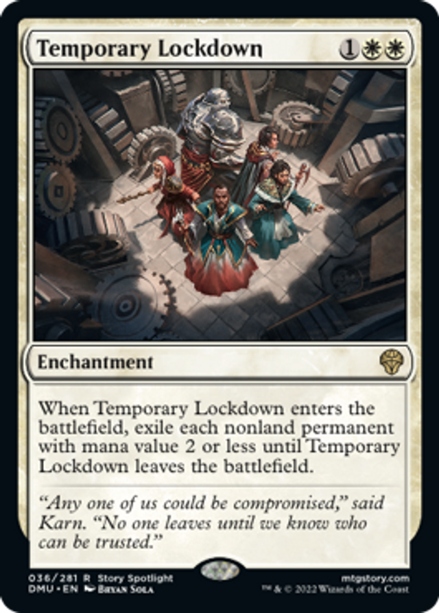 When Temporary Lockdown enters the battlefield, exile each nonland permanent with mana value 2 or less until Temporary Lockdown leaves the battlefield.